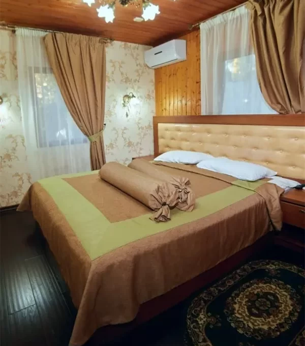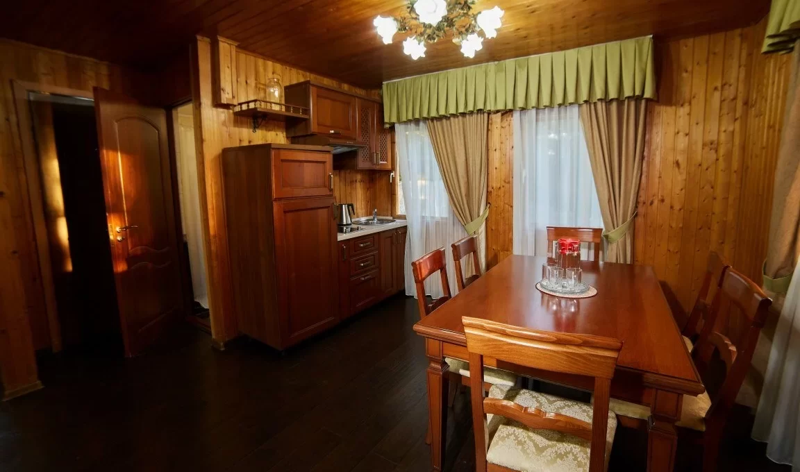 Отдельно стоящий в парковой прибрежной зоне санатория просторный деревянный коттедж. Оборудованный мини-кухней, санузлом, гостиной и двумя спальнями.
