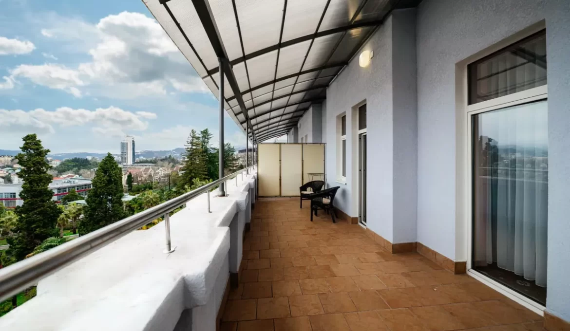Просторные комфортабельные номера с гостиной, спальней и большим балконом, с которого открывается просто потрясающий вид на парковую зону с реликтовыми растениями и море. Гостиная