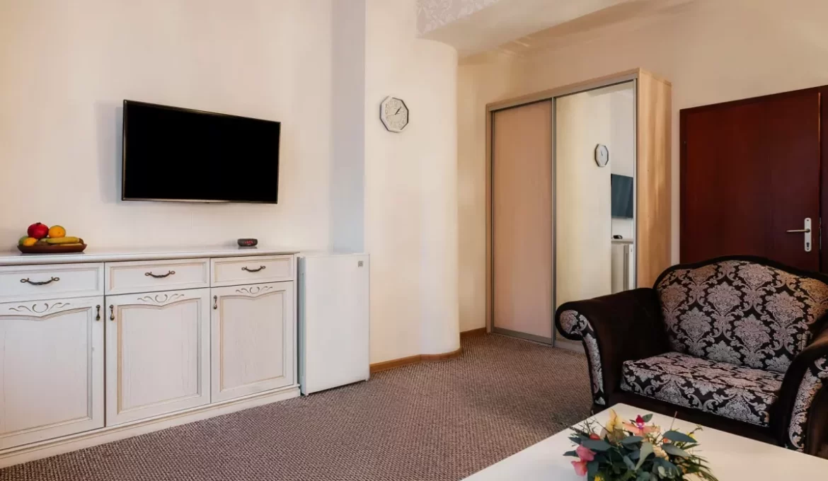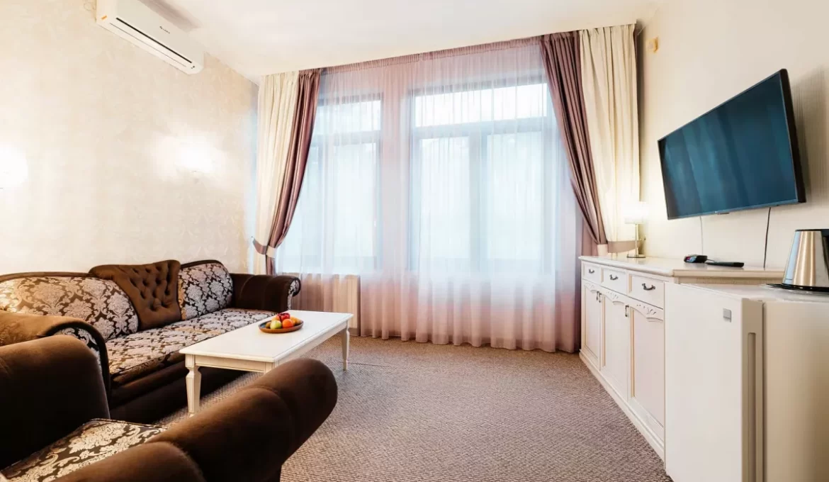 Просторный двухкомнатный номер с уютной спальней и гостиной, в котором есть все для комфортного проживания и отдыха. Красивый вид из окон на горы.