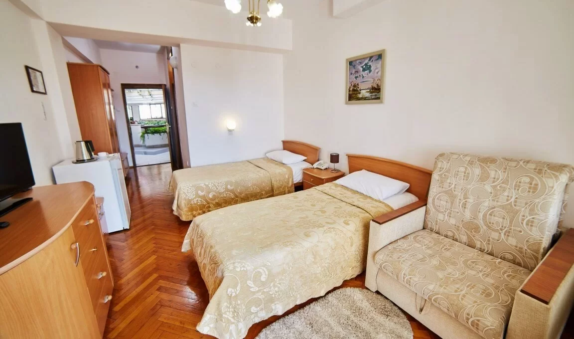 Номер площадью 22 м² прекрасно подойдет для комфортного отдыха вдвоем. Есть большой балкон с ротанговой мебелью, с которого открываются красивые виды на море и парковую аллею.В номере: