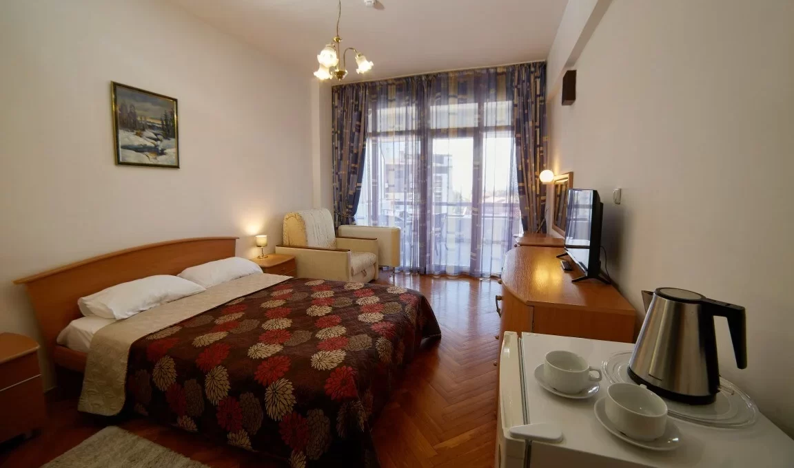 Номера расположены в четырехэтажном корпусе, где  расположен так же ресепшн и лобби-бар. Корпус утопает в зелени.В номере: